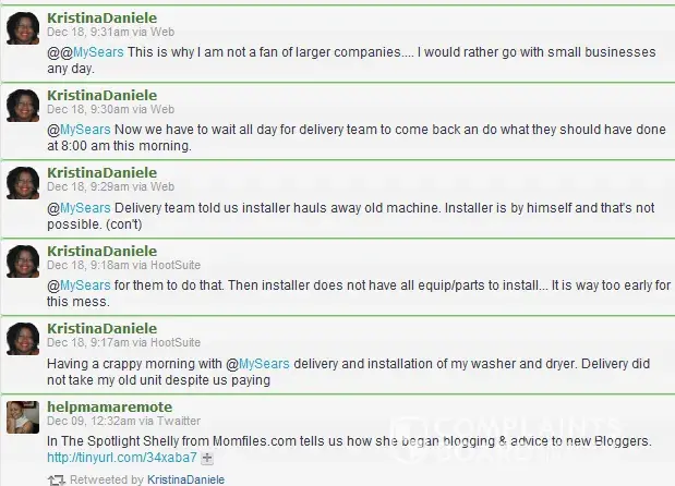 And for $1800 we had nothing but stress and headache. As you can imagine we are extremely angry and disappointed. We e will NEVER by merchandise from Sears again. And I am not the only person having these problems with sears. Their Facebook page is filled with similar complaints and stories.