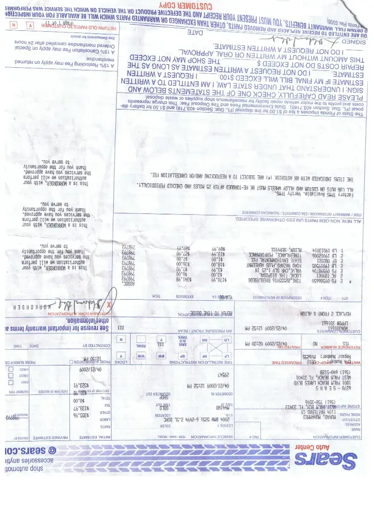 I bought 2 tires for my bmw 525i in march 21 2009 from palm beach sears. And I had a noise from the tire after one year. I went to sears in boynton beach because palm beach sears was closed business. I explained the situation about tires worn out and make noise while I drive 40 miles per hour. I talked to the manager dana taylor and explained to him. He said I have no warrenty although it says it has 60000 miles warrenty. He told me your tire is bad because your suspension is bad. I told him I can prove that my car suspension is good. He was very rude behavior and not resfect for customer. I thought I was treated very poorly and I felt very upset. I dont think dana taylor is qulified manager for auto center. I hope you can response me as soon as possible.