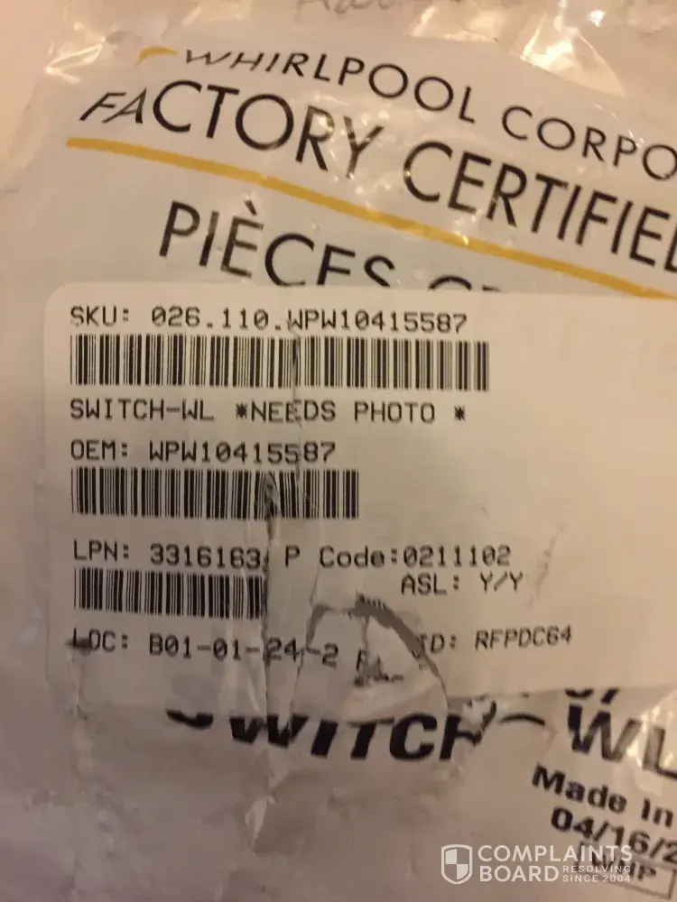 I have Sears Appliance Home Warranty (Plan [protected]). On 11/6/21, I requested service for washer with F35 and SUD error codes. Technician came out on 11/10/21 and he ordered the part "Washer Water-Level Pressure Switch #WPW10415587." He set up an installation appointment for 11/22/21 as he anticipated the part would be available by that time. I received a...