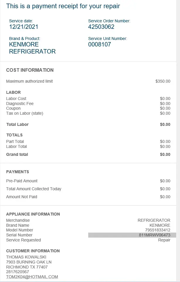 Sears Home services technician Emanuel M. dispatched to my home on Dec 21-21 to make repairs on my Sears Kenmore refrigerator (pn: 795.51833.412) (serial # Serial Number: 811MRWV06473). The technician indicated he could not find the data plate and left without completing any troubleshooting or repair. The model number is also on the back of the refrigerator and the serial number is already recorded in the Sears Home Services system (I had a repair in 2020). Please review the attached documents and explain why my refrigerator could not be repaired by your technician. He should be terminated for his laziness in researching available data and the bad attitude he displayed in my home.