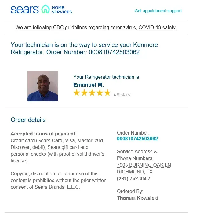 Wilson Reeves (11/2/2021, 11:26:04 AM): Thank you for Trusting Sears Home Services. Take care and be safe from the COVID-19.