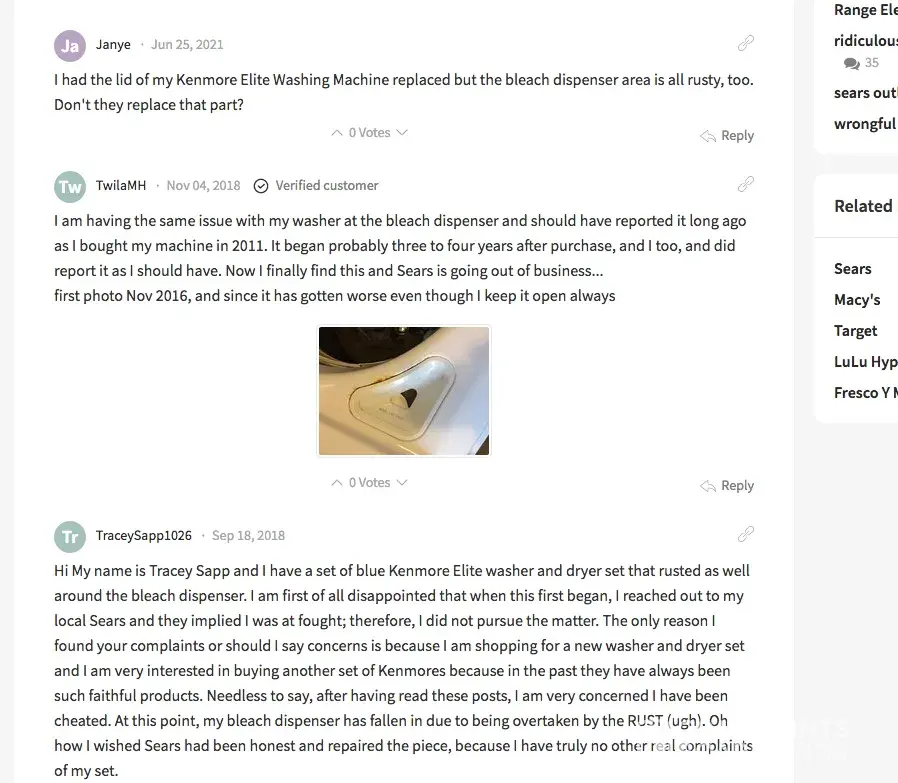 bleach port rusting and degrading, ongoing problem since 2014. Bought machine in 2011 and I did report with no resolution. this is a not a problem I have caused as I always leave my machine open after use. This is a flaw in design by the builder and should be taken care of by them with help of Sears to the maker