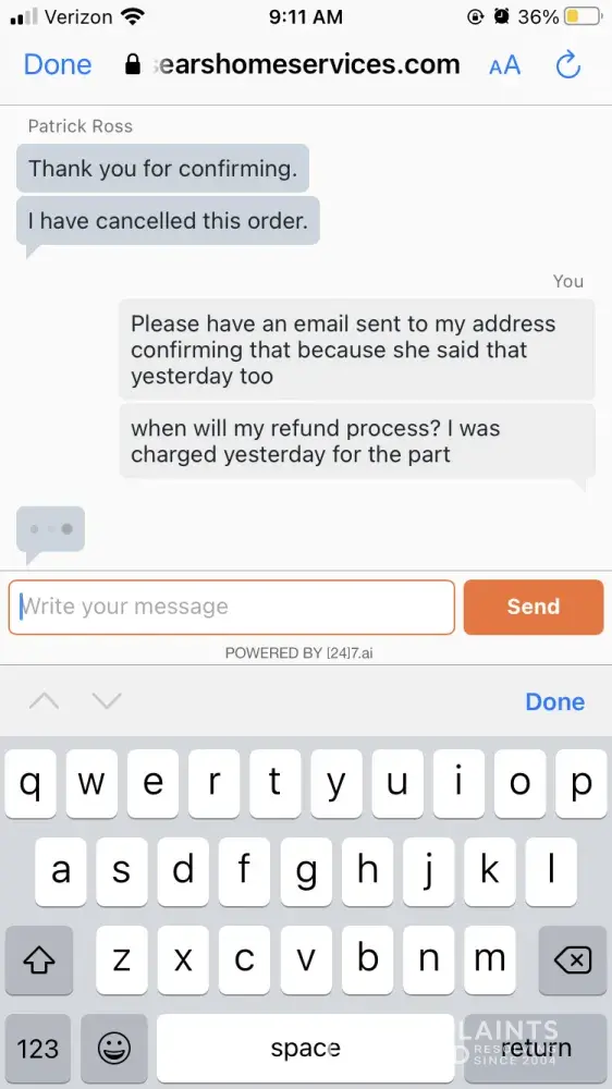 On 11/28 I ordered a part through Sears and cancelled it within 30 minutes of ordering, or so I thought. I spoke to a customer service agent and she confirmed that it was cancelled. Monday I received an email saying my order was received and I was charged for the part. On 11/30 I contacted customer service asking that the part be cancelled. On 12/3 I contacted customer service AGAIN asking when my refund would be processed and I was told that my refund would be escalated and that I would be called by the end of the day. I was not called. I called again on 12/4 and was told that it would take up to two weeks to receive a refund and that there was no way to contact the refund department directly. I then explained that the refund had already been escalated and the response was that I would receive a phone call by the end of today.