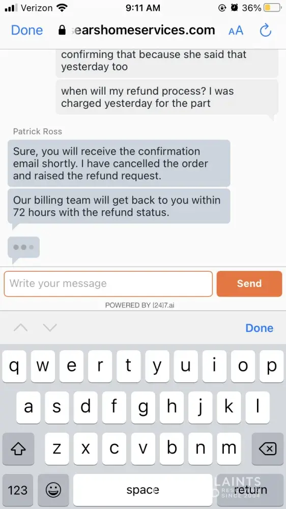 After hours on the phone, given the run around and told conflicting information, I am growing more and more frustrated with sears. the bottom line was that I ordered a product, did not receive it, and cancelled the order. Due to processing issues on sears end, I sat through hours of phone calls while sears tries to figure out why their records are inconsistent. The only way this problem can be resolved is if I see my full refund promptly.