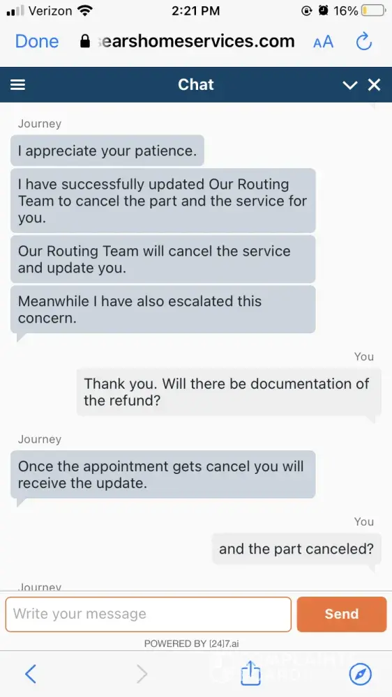 5/ Called Sears and told them the problem. They initially said that RR appliance had not closed our tickets so they could not do anything. After several calls they sent an email to another department to get the ticket closed.