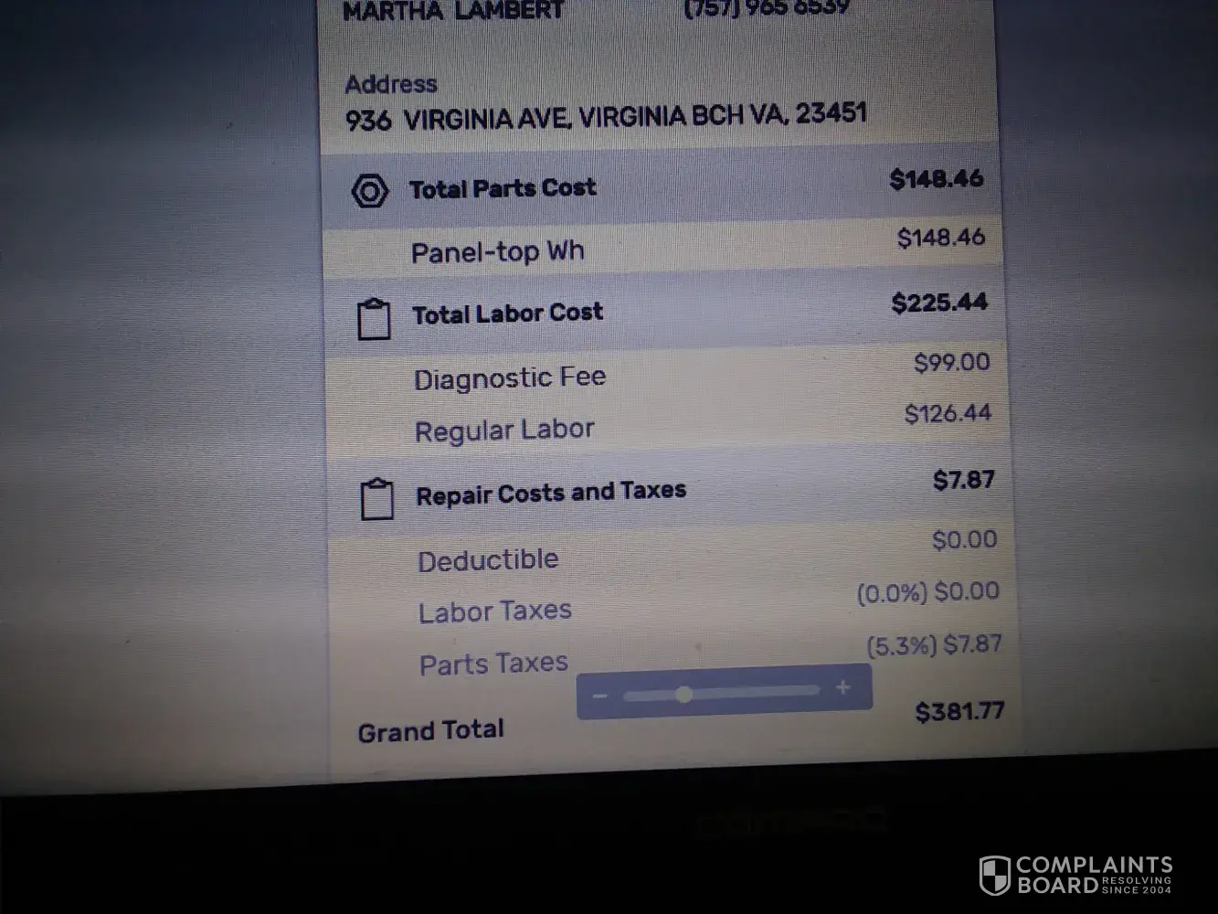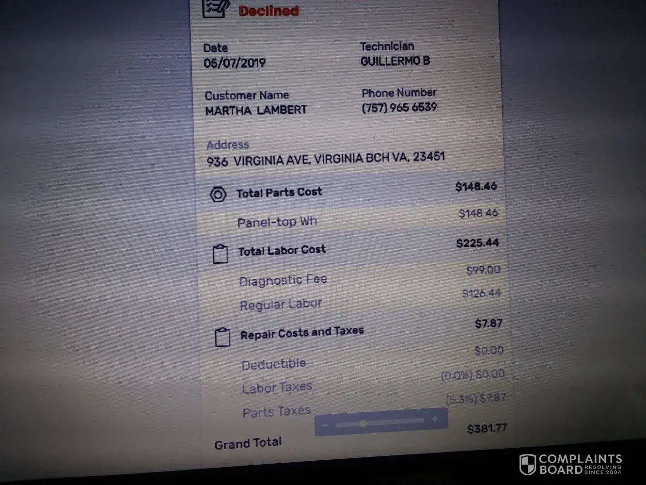 April 22, 2019. Technician came to assess/repair my dryer. He was pleasant and explained to me the issue — thermal fuse needed replacement. He did the replacement. Assessmt/repair took 20 mins total. Bill for service was $233.97! I was not provided with est. Cost before proceeding with the work so that I could decide whether to continue. I would never have agreed to this amount. I could have a neighbor replace this $10 part for free! I did not have a fair opportunity to make a decision — you state in your advertisement that technician is required to provide estimated cost to repair before making repair so I may decide. I was caught off-guard by this exhorbitant price for 20 mins work and a $10 (or less) part! I paid it but after reading your information that I should have had a chance to consider this huge cost before repair, I feel I am entitled to a refund of a good part of this huge cost I paid. What can you do to help me minimize this financial cost since I was not informed? James was personable but missed the most important step of telling me est cost ahead of time. Thank you for your consideration of my case. (district id: 8228) (tech id: 727446)