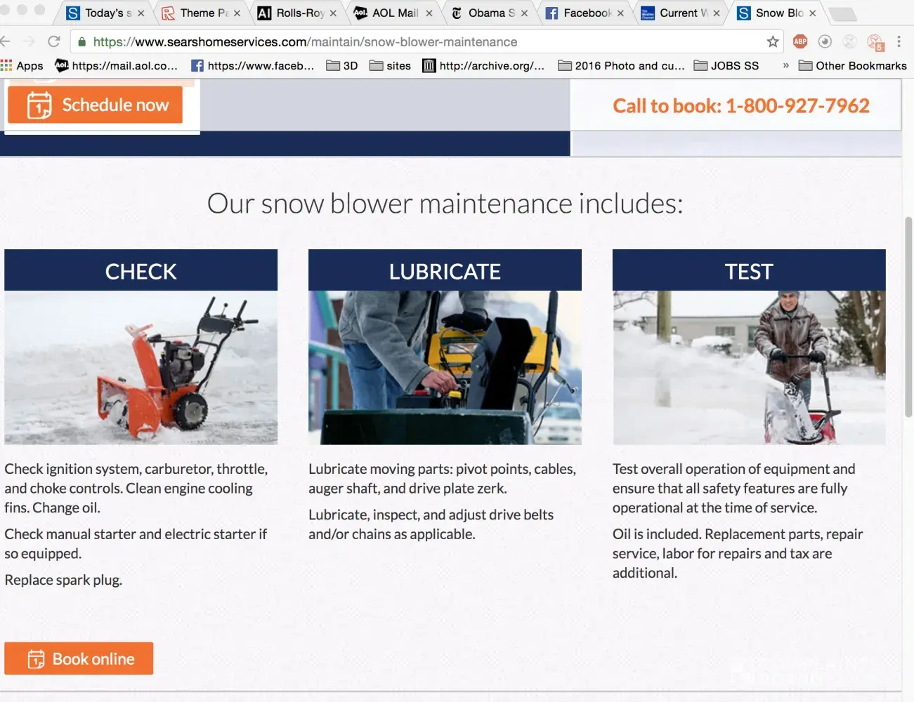 I hired sears home maintenance for a snow blower maintenance service. It was to include:check ignition system, carburetor, throttle, and choke controls. Clean engine cooling fins. Change oil. Check manual starter and electric starter if so equipped. Replace spark plug. Lubricate moving parts: pivot points, cables, auger shaft, and drive plate zerk. Lubricate, inspect, and adjust drive belts and/or chains as applicabletest overall operation of equipment and ensure that all safety features are fully operational at the time of service. Oil is included. Replacement parts, repair service, labor for repairs and tax are additional.
