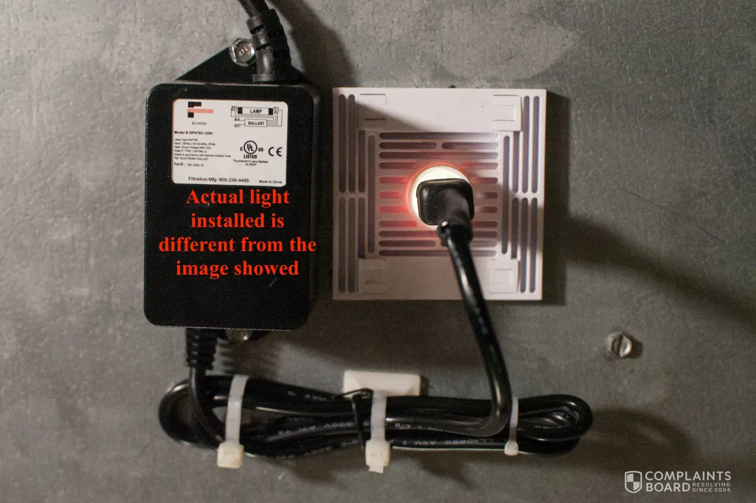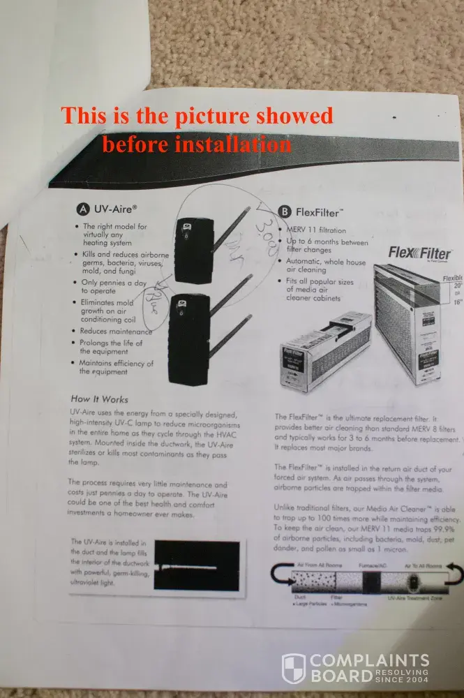 He showed me the images of "field controls uv aire" system (See attached photos) and I went for option (3) to have two uv lights installed to make sure that my new house is free of rust and mold. Only later I found that the lights installed are not the same as those in the images that he showed me. The lights installed are from an unknown brand that I cannot find online. Besides, field controls uv aire is only $180 per unit. I am charged for $700. This is clearly a rip off. I was charged for $1400 for a pair of lights (Unknown brand) that costs less than $400.