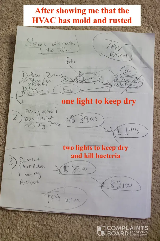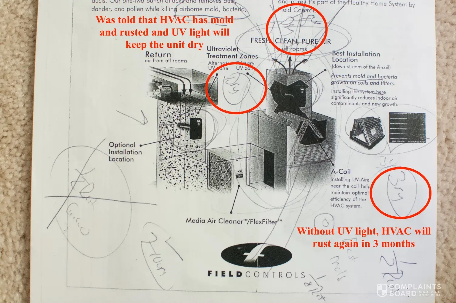 (2) showed me a picture of "field controls uv aire" system and installed two uv-lights for $1400 to keep hvac dry and mold free. Later found that each light costs less than $180.