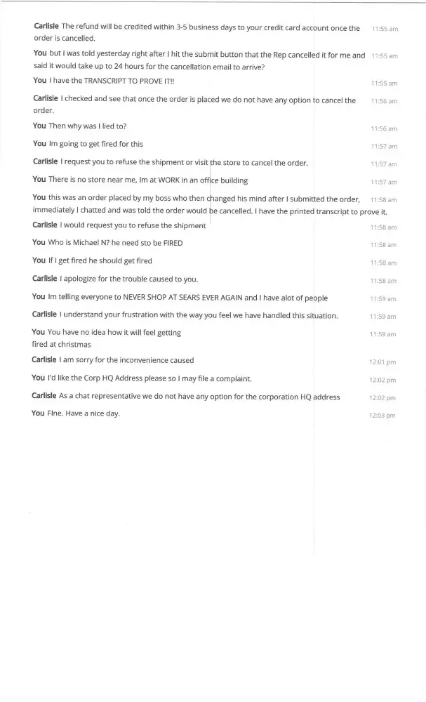 I placed an order for a pre-lit tree and ornaments for the office per my boss and right when I clicked the submit button Boss tells me he doesn't want to pay that price for those items so I immediately clicked on Customer Service Chat. I gave the order # and explained my dilemma and was told he cancelled the order and I would receive an email within 24...