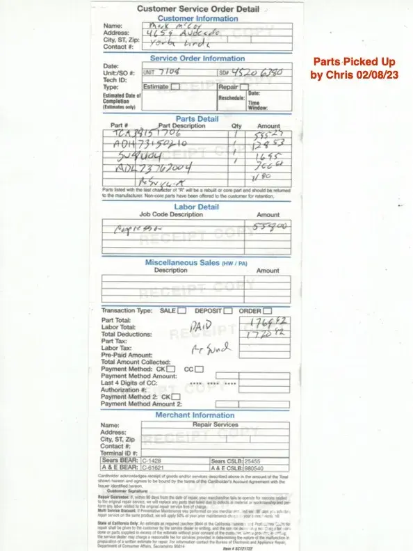 Sears Services Repair came out and ordered part for my Kenmore Refrigerator. Because of high cost and a replacement frig costing about the same I cancelled the repair and the technician came out and picked up the Parts. I was given a receipt for about $1720 to be returned to me and was only charged for the service call. When asked when I would get the money back the answer was very vague. I can not follow up with any direct phone calls and only get canned automated selection options. I can not find out when or how I will get paid my money. Sears Order number was [protected]. Parts were picked up Feb. 8. How do I get my money back?