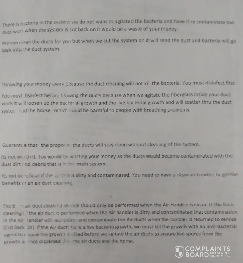 I think the document attached pretty much says it all. I called the office and asked to have a manager call me but nobody has called. Even if what they said about my a/c duct work is true, I would never have them touch my system. I've called another company. Don't trust Sears!