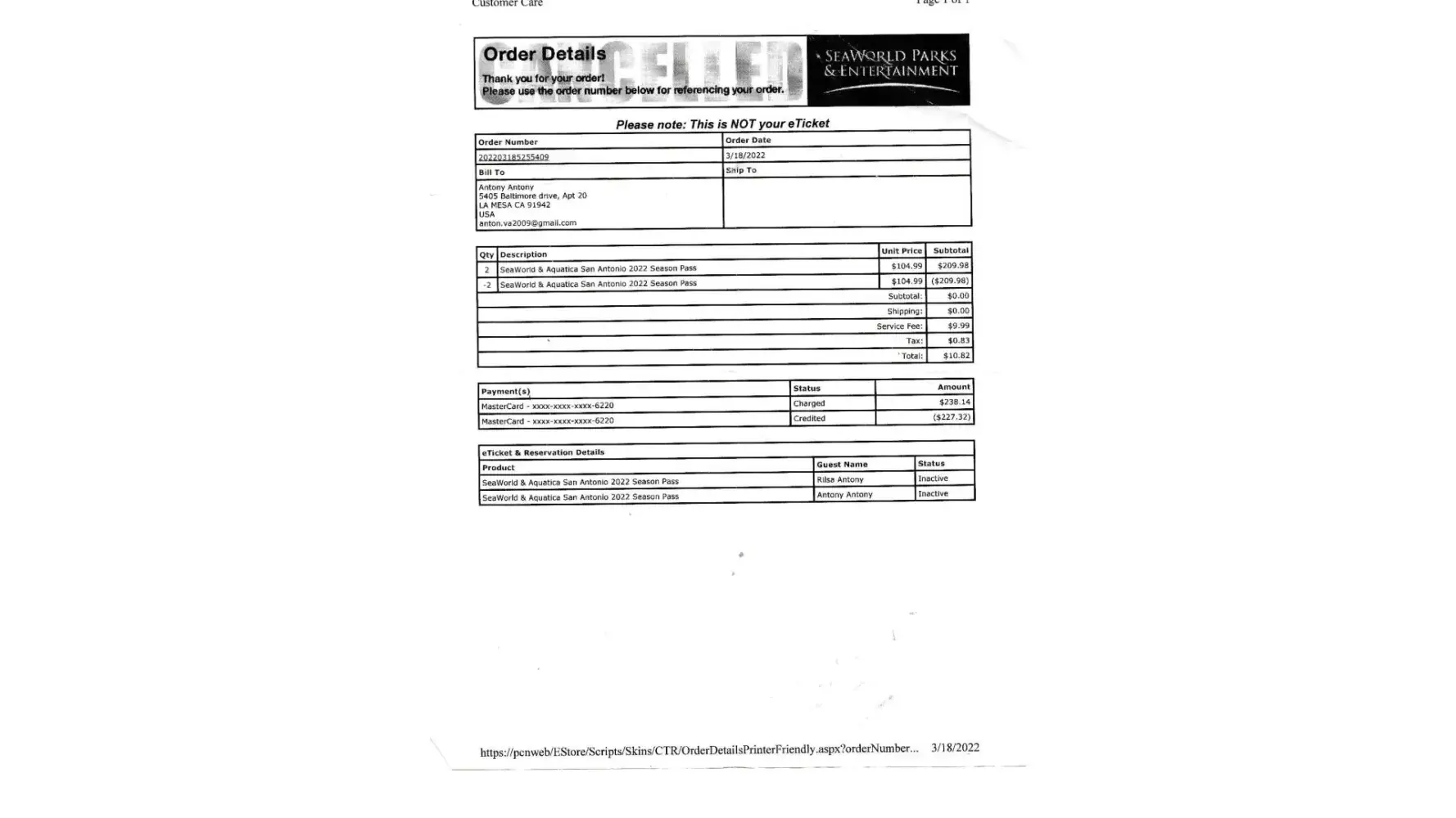 We requested for cancel ticket at gust service. They charged $238.14 and returned $227.32 on 3/22/2022. ($10.82 they took as service charge. I did not use that service, too?). Here is the attached receipt from seaworld.