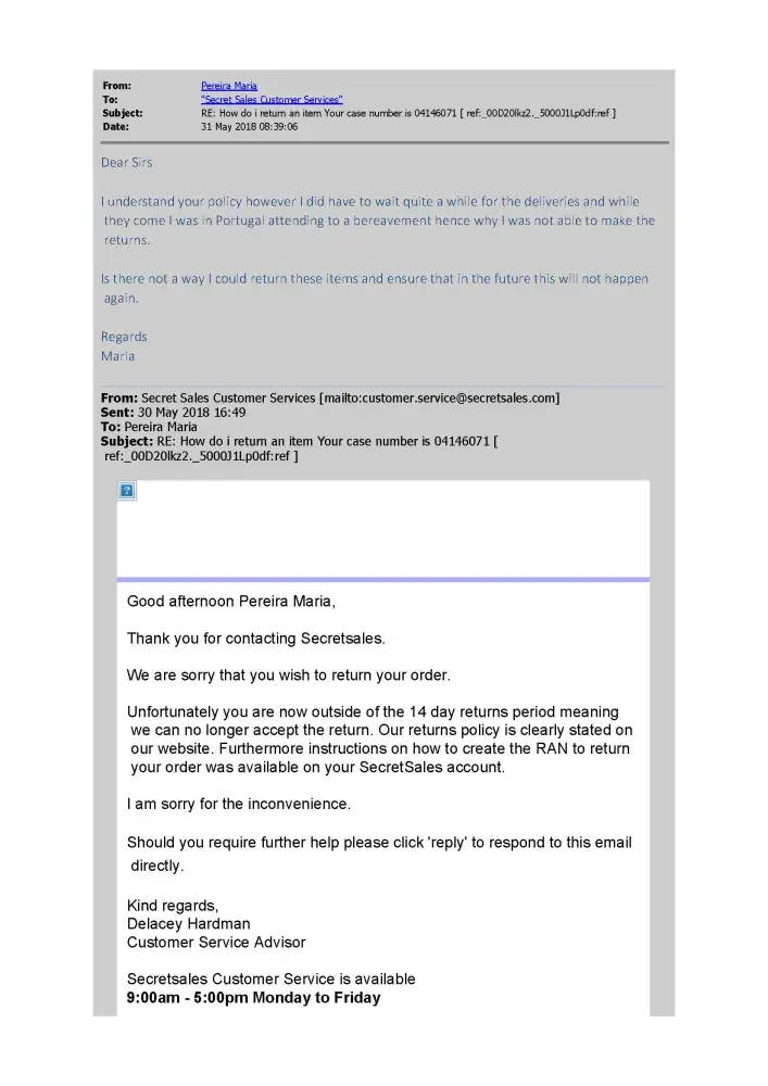 SecretSales customer service/returns