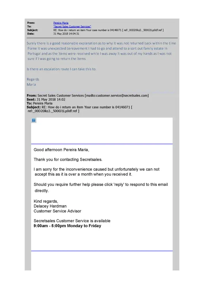 I complained about a Hoover and two laptops I bought from secret sales over two months ago they keep telling me to contact the seller and copy them into the email and this has been going on for over 2months now till finally the seller said they can't refund