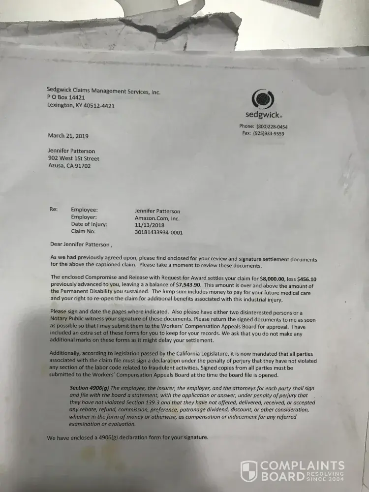 On April 03, 2019 I won my Settlement with Amazon and Amazon court ordered that a check for $8000 be sent to my residence on April 03, 2019. The check never arrived. So the check was cancelled on April 11, 2019 and re- issued. To be sent to my work at LA Fitness at 920 Freemont in Alhambra, Ca. I also made an account t on mysedgewick.com for my check to be directly deposited into my account on April 11, 2019; and Jennifer Garvey requested that the check be directly deposited on April 11, 2019. The check was not directly deposited. The check was re-issues on April 23, 2019; which Jennifer Garvey told me over the phone on April 23, 2019; plus she sent me an email verifying this on my gmail.co