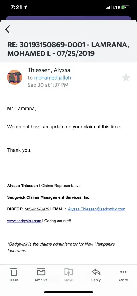 Last time, I asked to advise and information of visit the doctor or not that was invited by sedgwick. They said is covered, but it is not later on receiving a bill. A lot of people did much better than them. This is a waste and delay of time. They just open the arms and later is wrong and you pay the bill? I don't think so. I think if you make wrong instruction and advise. Depend on the incident lost. YOU go to jail. They are very careless. And always waste people money for not listening well enough of people/or adult questions? During his /her job duties. They just pretend peace like a kid and get pay check.