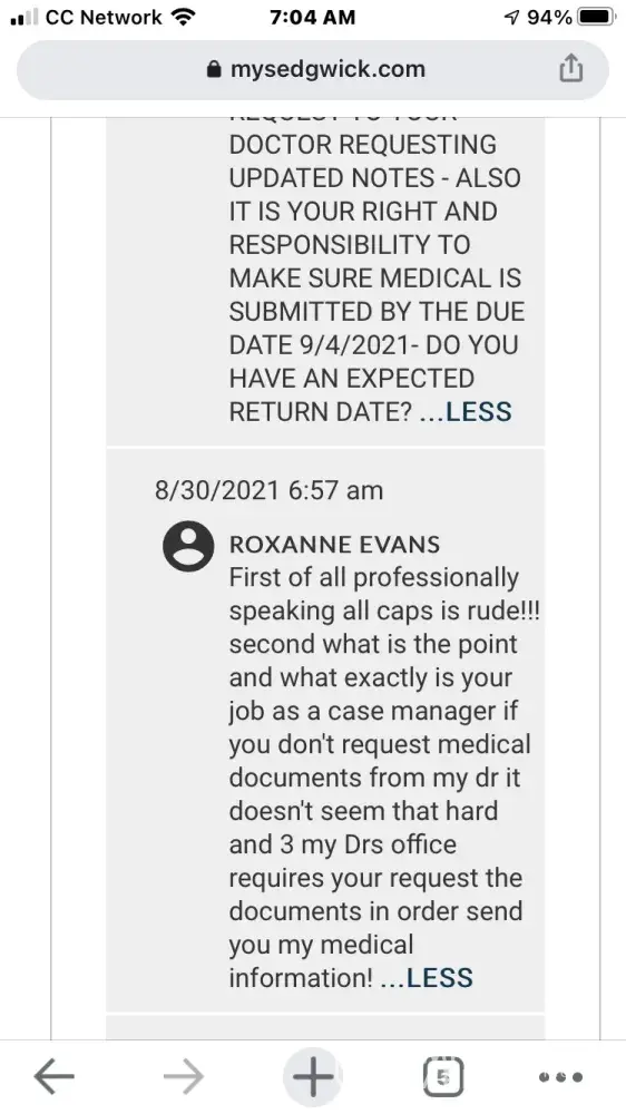 Case #[protected]. Was hospitalized from 4/15/21 - 4/22/21. contacted sedgwick message board on the morning of the 17th to inform them that I had been admitted for Covid pneumonia and a blood clot, Sedgwick responded on the 22nd stating that hopefully I get better and they need me to send dr notes asap as my benefits will be denied starting April 20th. Just curious why bother contacting me after I've been discharged, why not call me directly to ask how things are going. Why can sedgwick not call the hospital directly and ask for a copy of my file(signed the release form and included sedgvwicks fax number to forward the up to date file. I guess the employees at sedgwick are not required to make calls requesting medical documemtation better to have the person lose benefits and be considered AWOL, so they lose their job also.