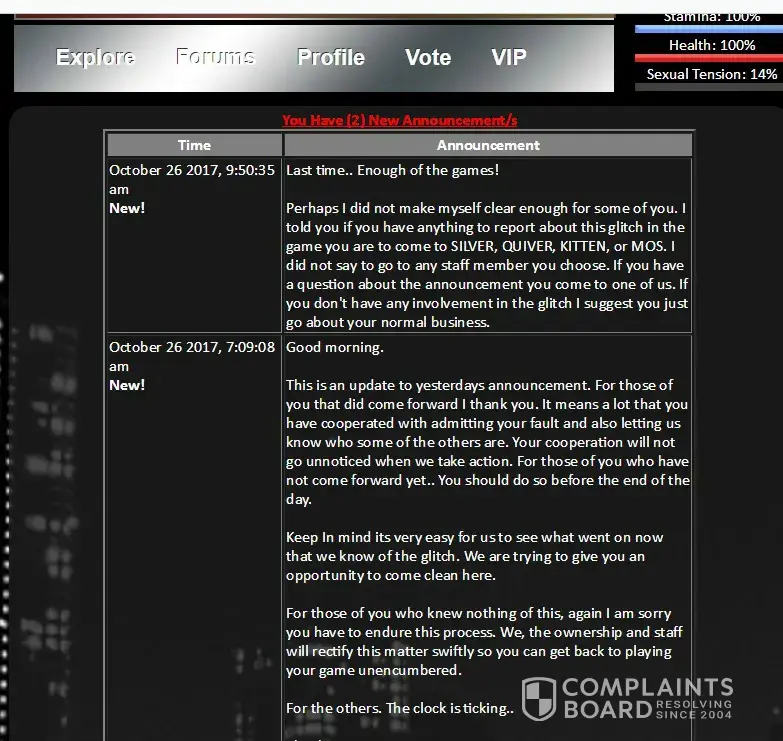 No using a bot to train with is not cheating or against the rules at all. Oh wait yes it is and that is why you were put into fed. In the 8yrs I have played the game I have seen A LOT of owners come and go and Master of Seduction has been the most fair, most open, and easiest one to approach, talk to, and willing to listen to ideas and suggestions from players. He has NEVER played favorites with any of the older players or given us free stuff. We all bought and earned everything we have. I have played a lot of games very much like this one and have always felt very intimidated by staff and owners, but not here. Are MoS or any of the staff perfect no! They are human, but they are fair and honest. You have a right to say what you like and I have a right to defend a game and group of people I respect very much. You cheated and that is why you were banned no other reason oh and this is not the first time you were put into fed. You have a habit of disrespecting staff, but please do continue as to how you were wronged and you are perfect.