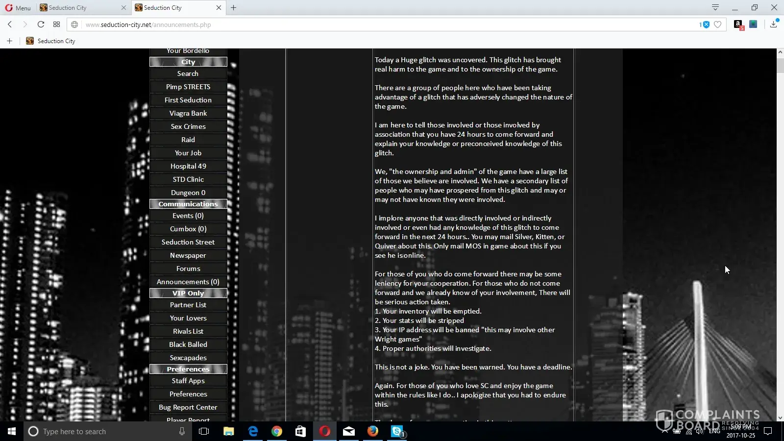 Do not know what part of I knew of no other glitch but a player using a auto refresher that you do not understand. But I id not know of ANY other player abusing any other glitch nor did I abuse any glitch. Nor am I whinning about not being able to play because I do not even want to. I violated no rule over and over, and here is the only other annoucnment made about the matter!