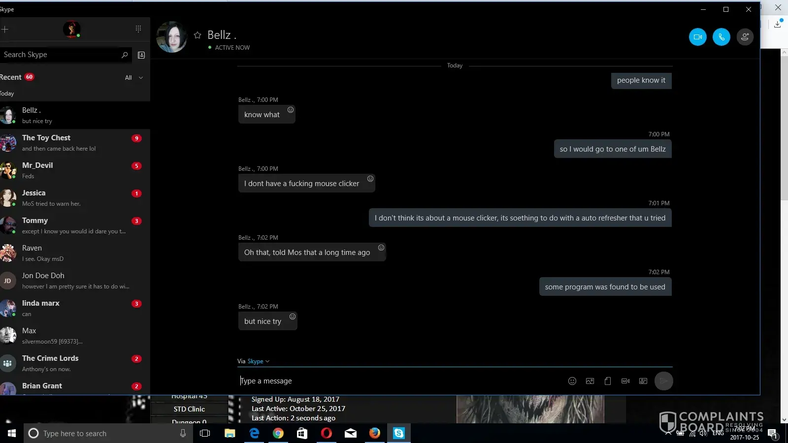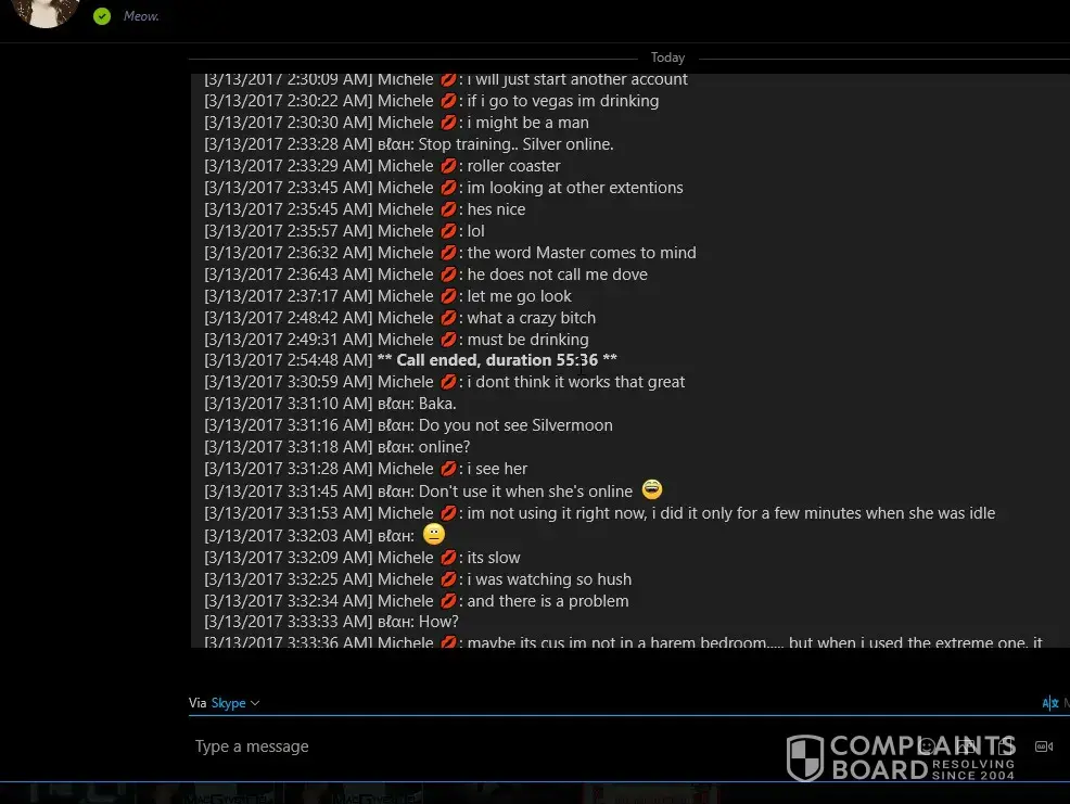 And how could I seriously alter the words she wrote that came off her own skype, she clearly admitted to it herself, anyone that talks to her knows that is her skype, but regardless I ain't gonna sit here and argue something that obviously wants to be buried. But at the same token don't sit here and nonchantley refer that there was any kind of proof on me other than trades with other people, ( and if that is not at all what you meant by that comment then I do apologize ) what or if someone did anything I still did not know, yes I probably should have called but my number was left and I was supposed to be called the day before, since I did not get a call, I woulda thought I was alright and flew way way off the handle when I was pitted as I felt my money was wasted and I was treated very badly as a paying customer, just as you likely felt if you thought someone was stealing from your Business you were being screwed over, just as I do not feel that we should not be pitted a flippin year for going to another site and disputing something.