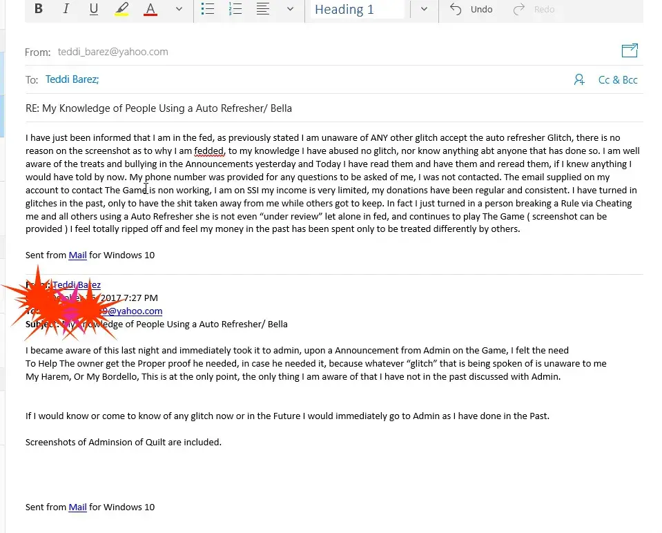 mmmmkay lets try this again pumpkin, the whole Auto refresh thing is not a glitch that is a whole different issue, the glitch which was found had you in the mix of it along with multiple others now as i said if innocent you will be released if not well you will stay in fed, they never bullied there is no foul play i bid you good day my dear