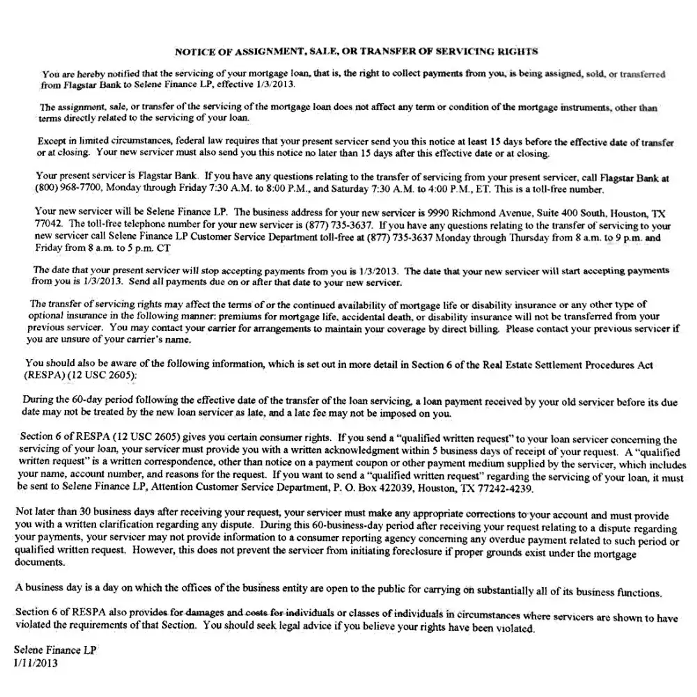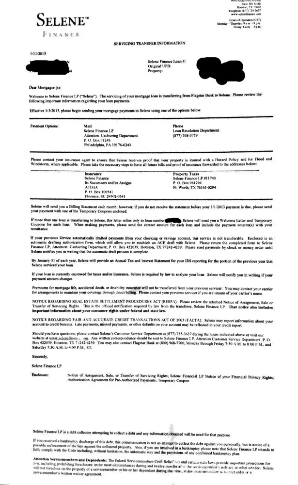 On the back of the letter from Flagstar, in the middle it is our rights~ basically when a mortgage has been purchased like this the lender (us) have 60 days grace time to get it all figured out and they can't charge a late fee not count it against credit score! Alls I can say is Selene finance is a joke! Rude reps on the phone and harder than hell to get. Live person on the phone and like you I've never n