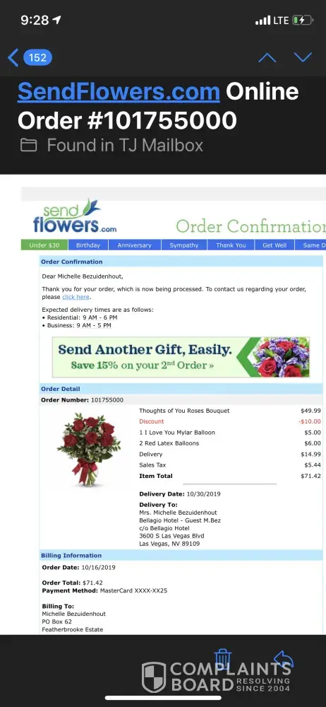 Can't believe this company is still in business. Unfortunately I didn't read the reviews before placing a balloon order with send flowers.com. I must have spent 45 minutes placing my order over the phone Sept. 18th 2019, then never received an email confirmation and the balloons were never delivered. This was supposed to be same day delivery which I was charged for. The person who took my order also charged me for the deluxe balloons when I wanted the regular order, when I questioned the price she told me that the regular order was not available in that area however she didn't give me that information until asked. Sept. 19, 2019 I called the company and they had no record of my order. I was even given an order number when I made the purchase which still didn't bring up my order. I called my credit card company and I was charged $50.74 for the order. Now I'm waiting to see if the purchase goes through or fails. I was unable to cancel the purchase with my company. I feel like I've been scammed big time.