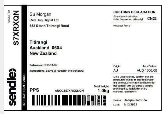 Sendle international Melbourne to Auckland
