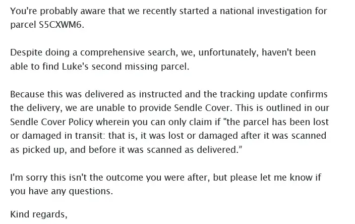 SDQCR38 Is the reference number. This parcel was picked up from my home to be delivered to my son in Tasmania. It’s never arrived. We both filed an investigation, to this date I’ve had not one email, phone call to say what is happening. Apparently the investigation is closed but I’ve still heard nothing and my son hasn’t got the parcel. I’m very angry about this, and there’s no way to contact sendle for answers or information. I don’t know what we are to do next.