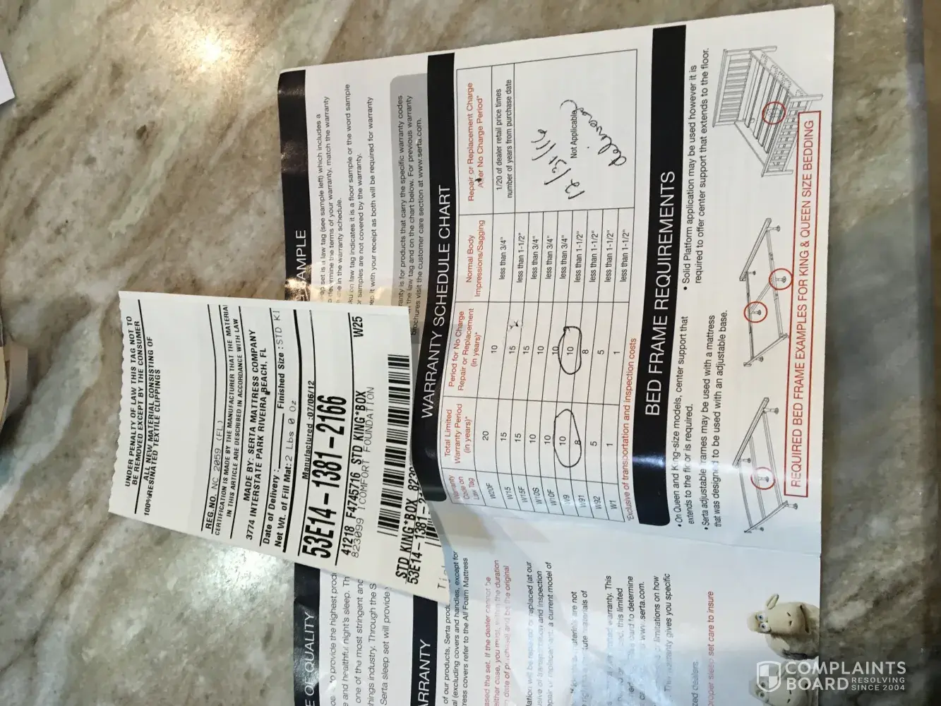 I am extremely upset. Based on Sertas explanation the whole process should have been completed within 15 days. Todate, I still do not have a mattress. I have been inconvienced for the past two weeks. If you check the delivery company's record they called and changed the date of delivery 3 times. I should be compensated for Sertas bad service.