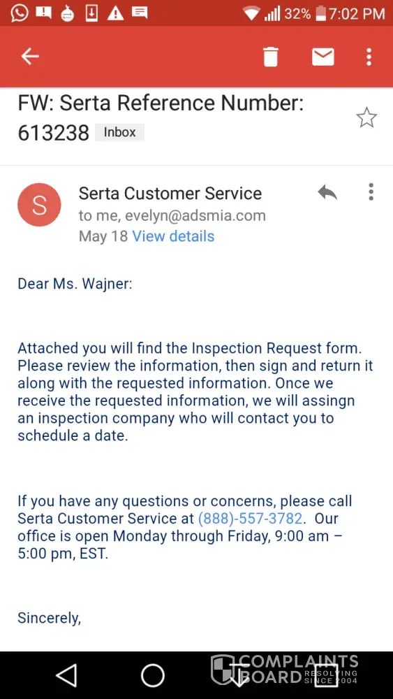 Hope Serta is happy with their customer service.