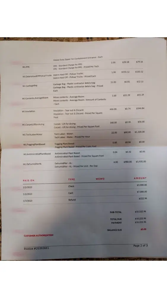 Invoice that was sent to us shows we were charged a mobilization fee which is explained to us as an out of state fee of 2234.69. We have 3 adults in this house the day he came in. He did not state this fee what so ever and I did not sign an out of state fee anywhere. I could have gotten someone local but heard great things from this company. The hidden fee should have been clearly discussed, not hidden. Insurance will not pay for this so now we are out 2234.69. The company will not work with us at all. Our insurance also reported a discreptancy of