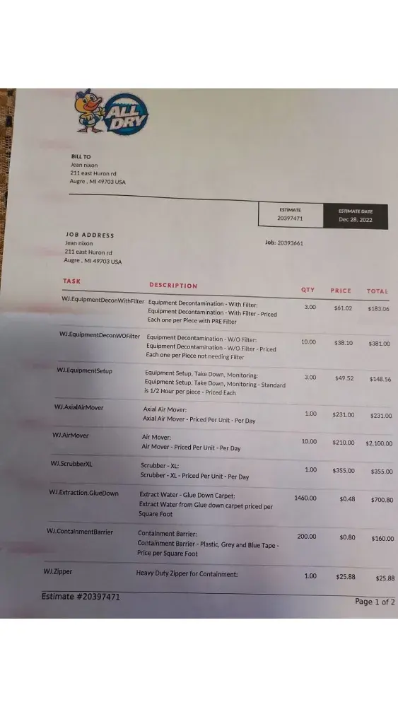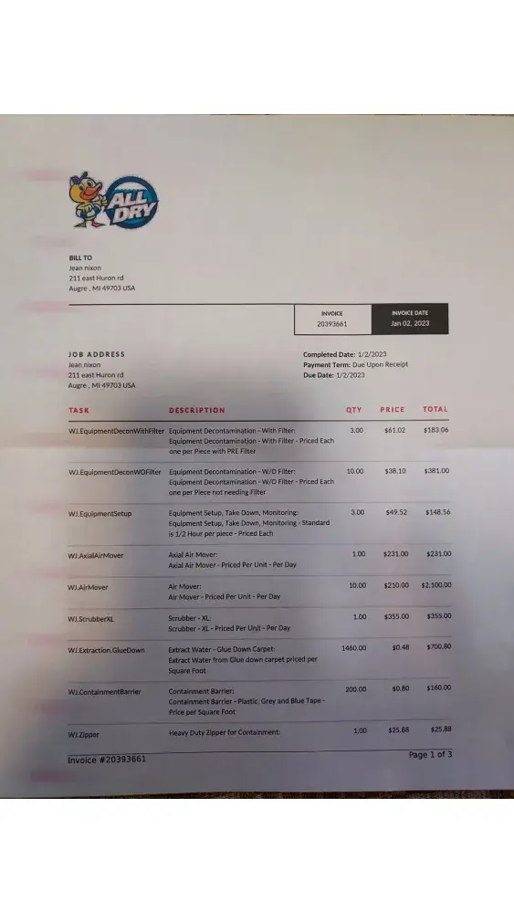 This company, "All Dry"..contracted by ServPro, in my estimation, needs to be looked at by ServPro to see if they deserve to carry your business name.