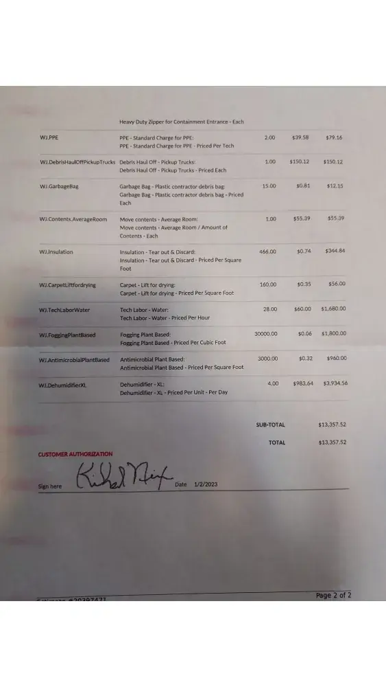 This was on Dec 27. They came back on the 28th and brought more fans. They were back on the 29th and removed the carpet from one small bedroom and again on the 30th and removed some insulation from the downstairs ceiling. They also moved the fans. They came again on the 31st and moved the fans again. Each time they came they were there was only for a brief visit.. not more than 1 to 3 hours. The 1st was a holiday and on the 2nd they came and removed the fans and gave us a bill of 13,357.52.