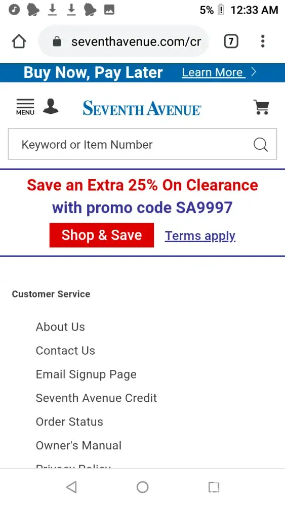 I was under the impression that I have a credit limit with seventh avenue and everytime I have gone to place a order I'm informed that I have to make a payment first what's the point of having a credit with them if you have to make a payment first it is supposed to be buy now pay later not place a order and pay up front it's a [censored]ing joke and I will tell everyone that asks me about this site I will make damn sure to let them know not to order anything from them because it is faults advertising