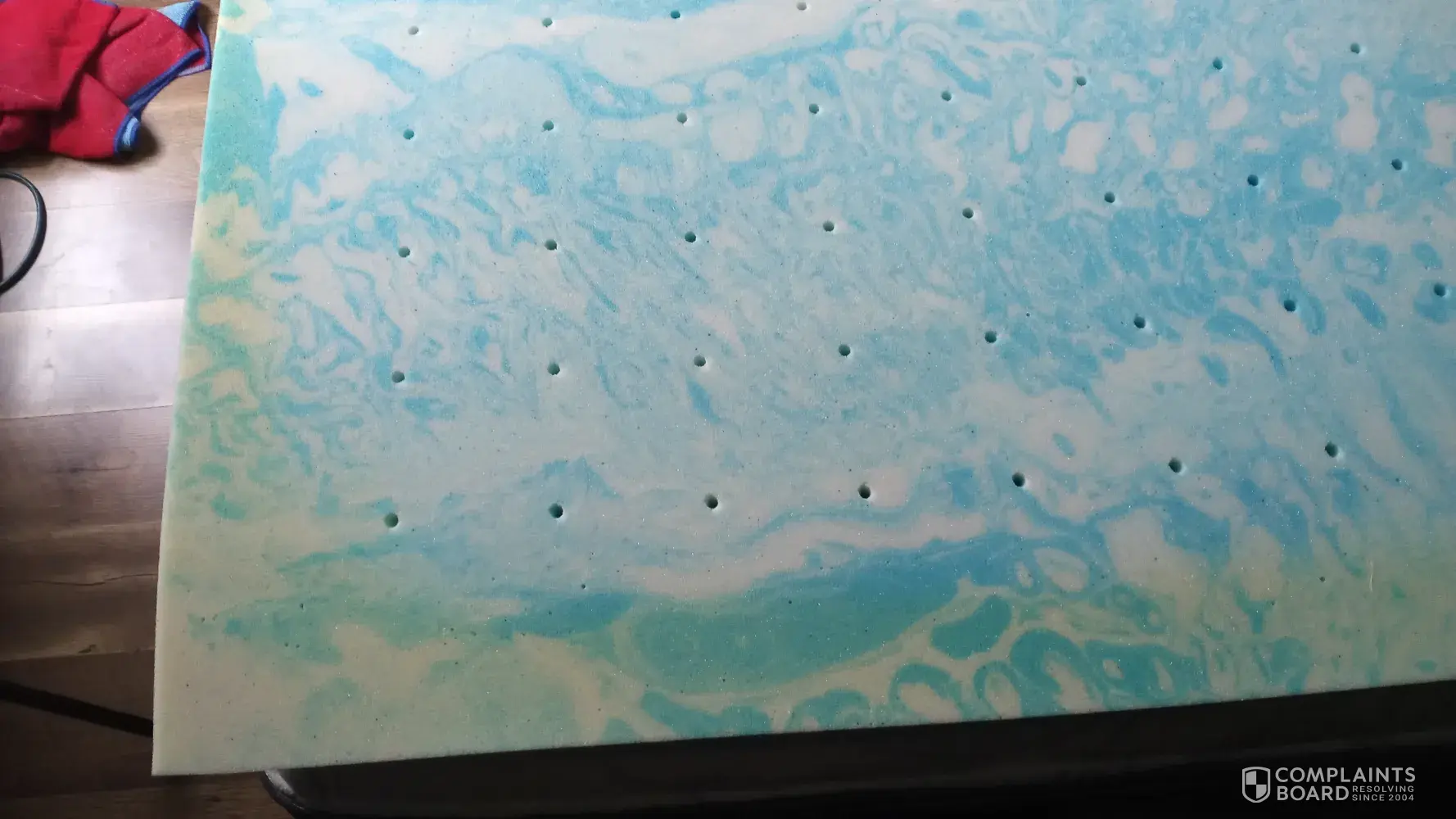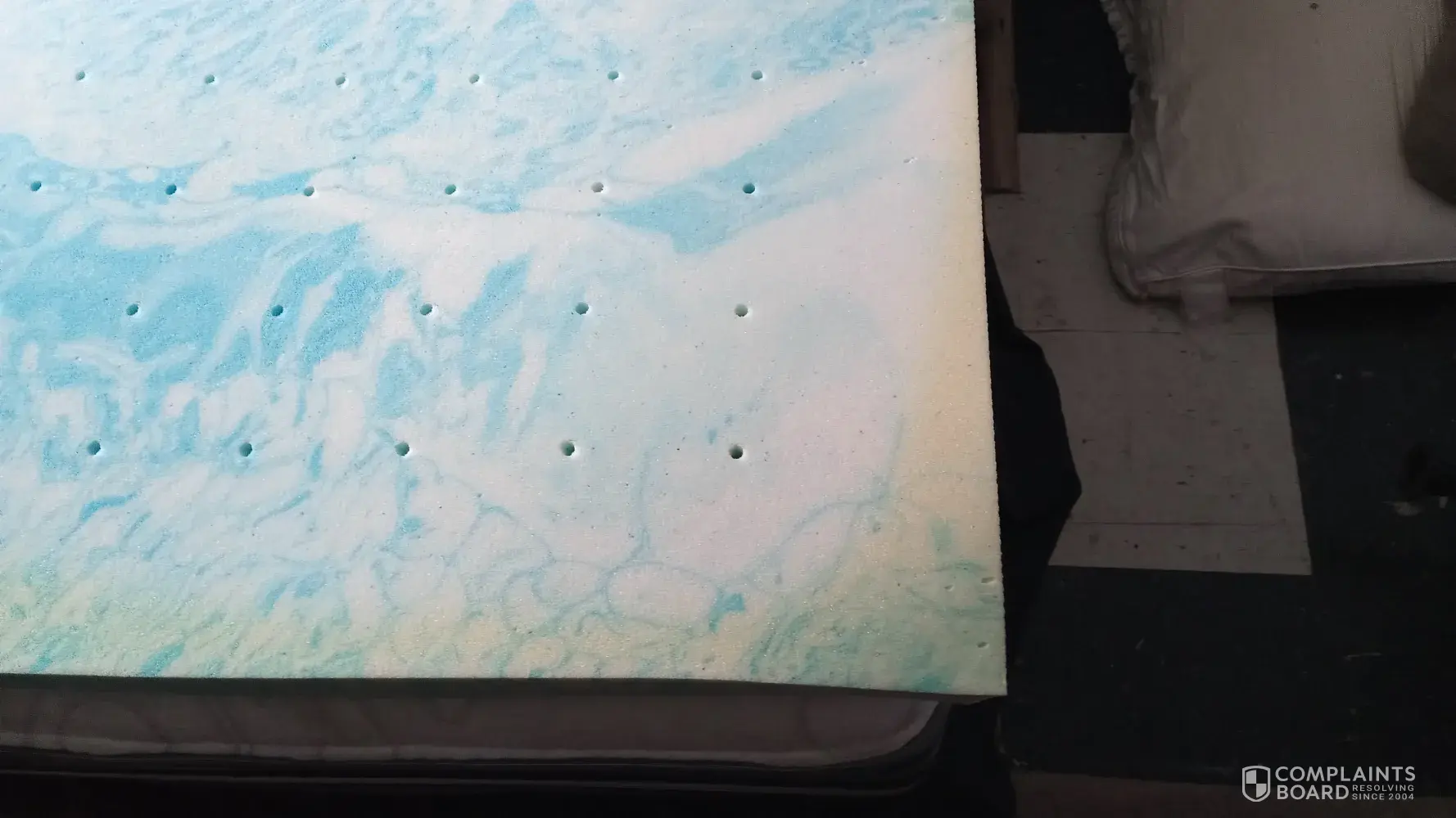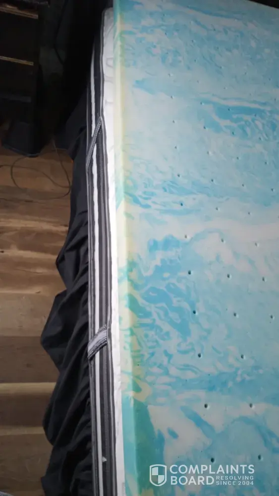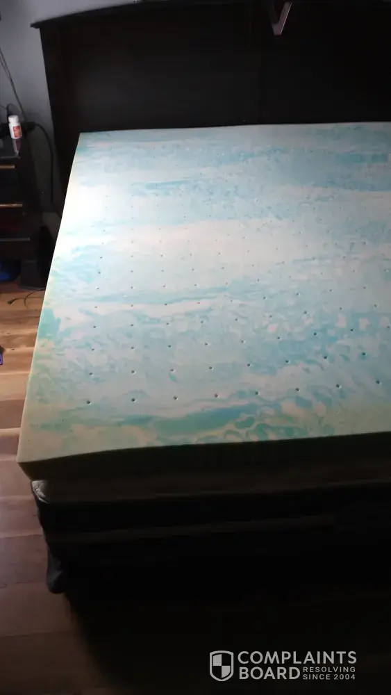 I received it and we opened the box, we let it sit for a week allowed it to fully open up.i put it on my bed and it smells like mildew.and it has yellow marks on it.im in closing pictures.its the california king Cooling memory foam topper item number DT770136 on page 107..I had to remove it off my bed due to the mildew smell and the yellowing.My husband is very upset.. please try to correct this.we have not slept on it yet.