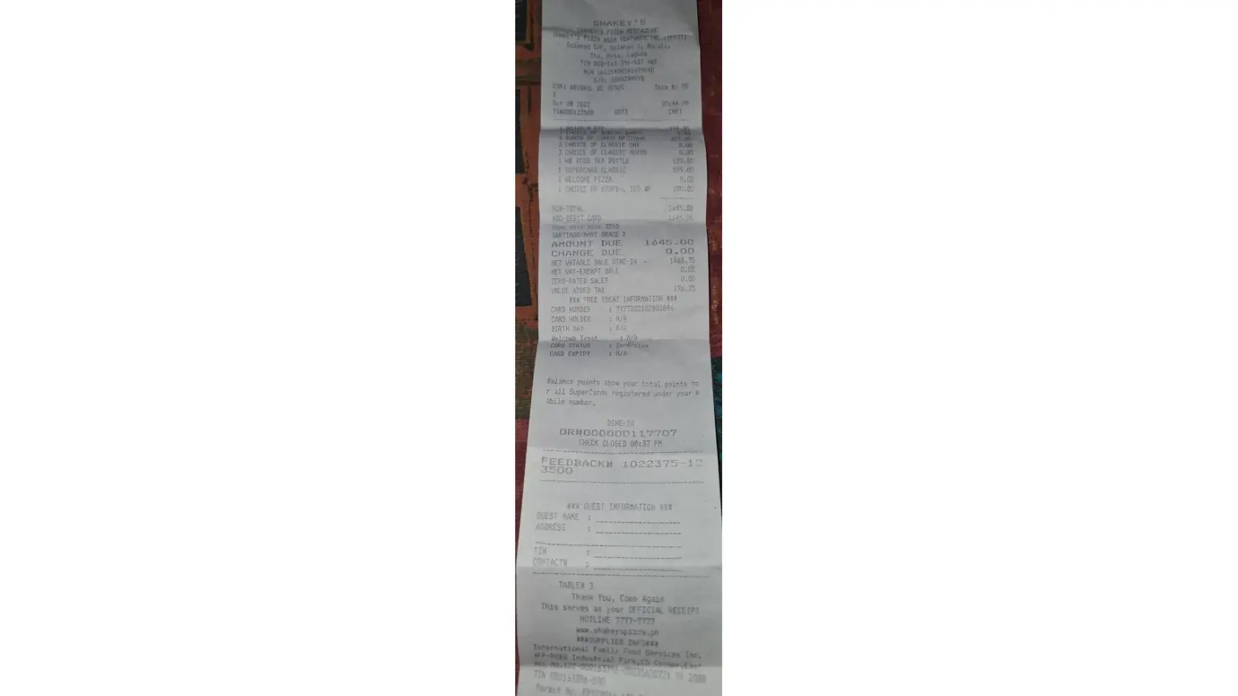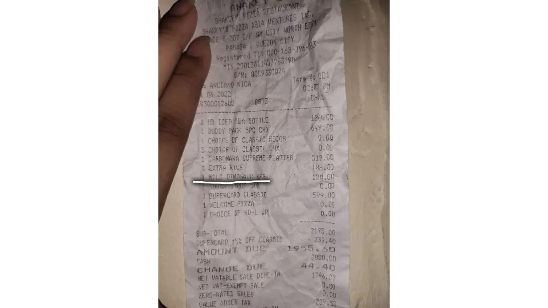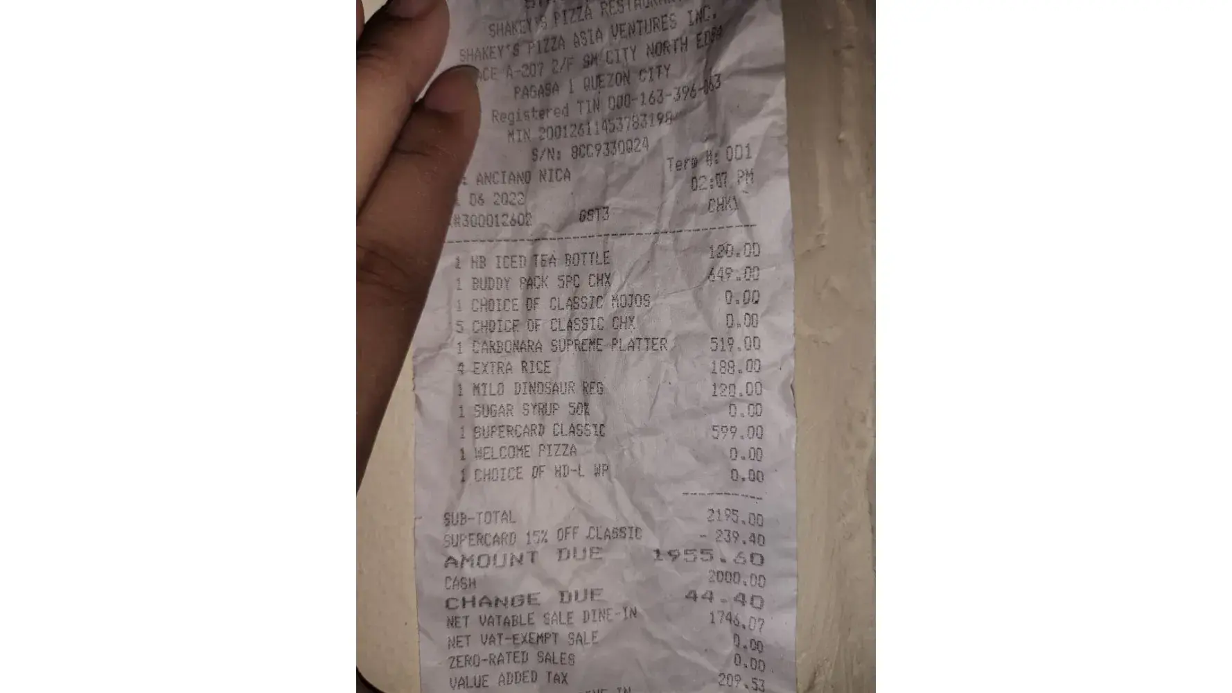 Shakey's Sm North Edsa is a total scam! I clearly told the waiter na ang order namin ay ung Deal 2 which cost around 1,700 pesos and 4 extra rice. They gave us free card and "FREE" milktea kasi more than 500 plus daw ang order. I clearly stated sa waiter na gusto kong gamitin ung existing card ko for my discount ang sabi niya bawal na daw gamitin dahil gagamitin na lang ung new card na ibibigay nila for my discount. NOT UNTIL I SAW MY BILL! Kung susumahin lahat ng inorder namin wala pang 2k ang total namin WITHOUT THE DISCOUNT, pag kasama discount around 1,600 lang ang babayaran. THEY CHARGED US 1,955 PESOS with discount. EH KASI ANG GINAWA PALA NILA CHINARGE NILA SAMIN UNG MILKTEA WHICH IS CLEARLY STATED BY THE WAITER NA FREE AND THEY CHARGED US INDIVIDUALLY SA INORDER NAMIN WHICH IS NA DEAL NA DAPAT OR FIXED PRICE! (Attached photo below) SANA BIGYAN NIYO NG PANSIN UNG GANTO. KUNG ANO ANG INORDER NG CUSTOMER YUN LANG ANG IBIGAY NIYO HINDI UNG KUNG ANO ANO DINADAGDAG NIYO MAKA KOTA LANG KAYO. AT ANG WORD NA "FREE" PO SA TAGALOG AY "LIBRE" BAKA HO NALILITO ANG MGA TAO NIYO DIYAN SA SM NORTH. GOODLUCK HO SAINYONG LAHAT, SANA YUMAMAN PA KAYO SA GANYANG GINAGAWA NIYO. 😚