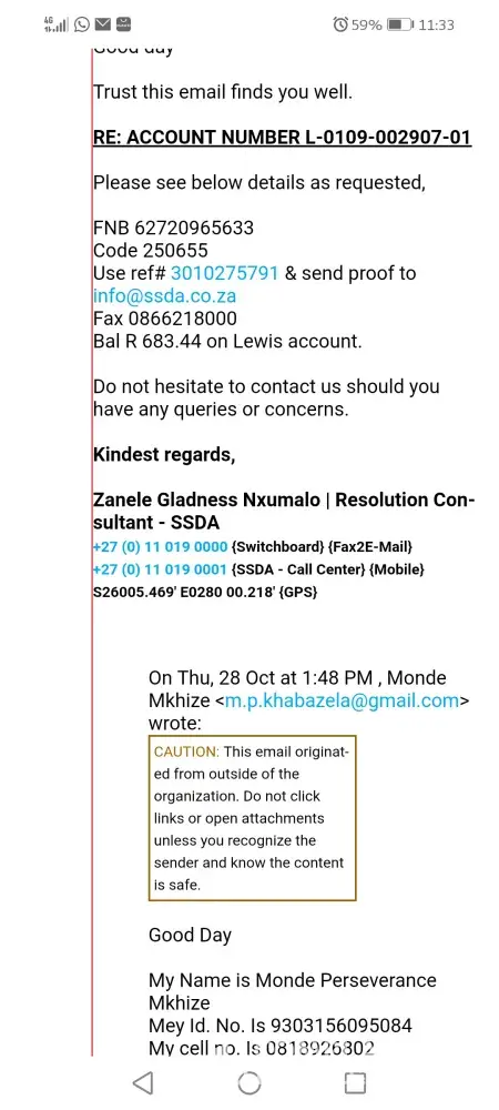 To this very day, I have made follow ups calls and followed up via emails to SSDA and it falls on deaf ears, yet I receive almost daily emails threatening to take further legal action against me, how is this fair, when I am trying to resolve the matter?