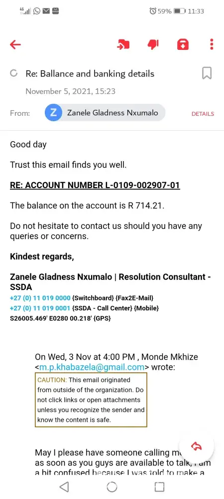 on the 21/11/2021I received an email from Zanele Gladness Nxumalo informing me that I still have an outstanding ballance of R683. 44 to pay on my account, on the 4Th of November I called in a shock as according to my knowledge the account is paid in full, the Lady I spoke to said she does not know what happened but all she sees in the system is that I have an outstanding of R683. 44 I then asked her if I can make the payment month end of November and she said yes and the balance will still be the same, on the 5th of November I received another email from Zanele Nxumalo stating that my outstanding balance has now gone up to 714, 21 I responded by asking her how can my ballance increase 2 times in one month and she did not respond, today 8/11/2021 I called and asked to speak to someone to whom I can lay a complaint and They directed me to speak to Abury and he could not pick the phone I was then told that he will get back to me till now there is no response.