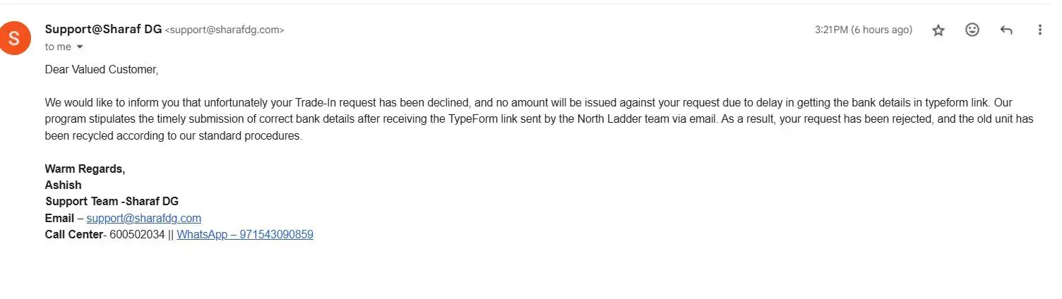 I am very upset with this and I have avoided Sharaf DG due to the lack of customer service.