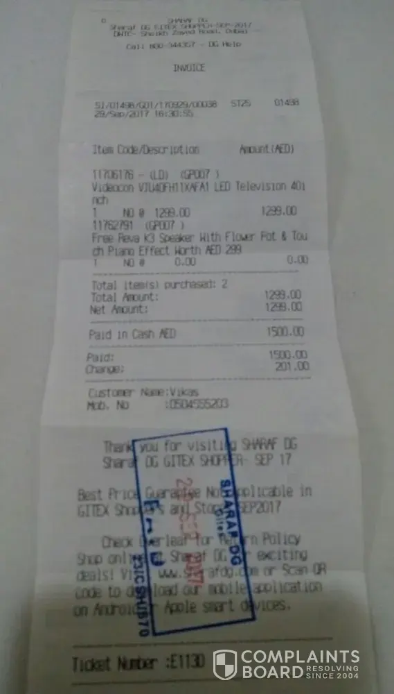 It was delivered to me on 10.10.2017 (after 16 days) and during this period i tried contacting Sharaf DG, they were unable to help saying that the invoice is not reflecting in system.