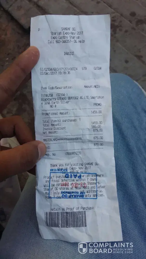 I purchased blackberry, model DTEK60 from sharaf DG out let in expo center, Sharjah on Sunday 03-12-2017. As per sales person, it was display piece and good and advises to take it. I believe and paid for that.