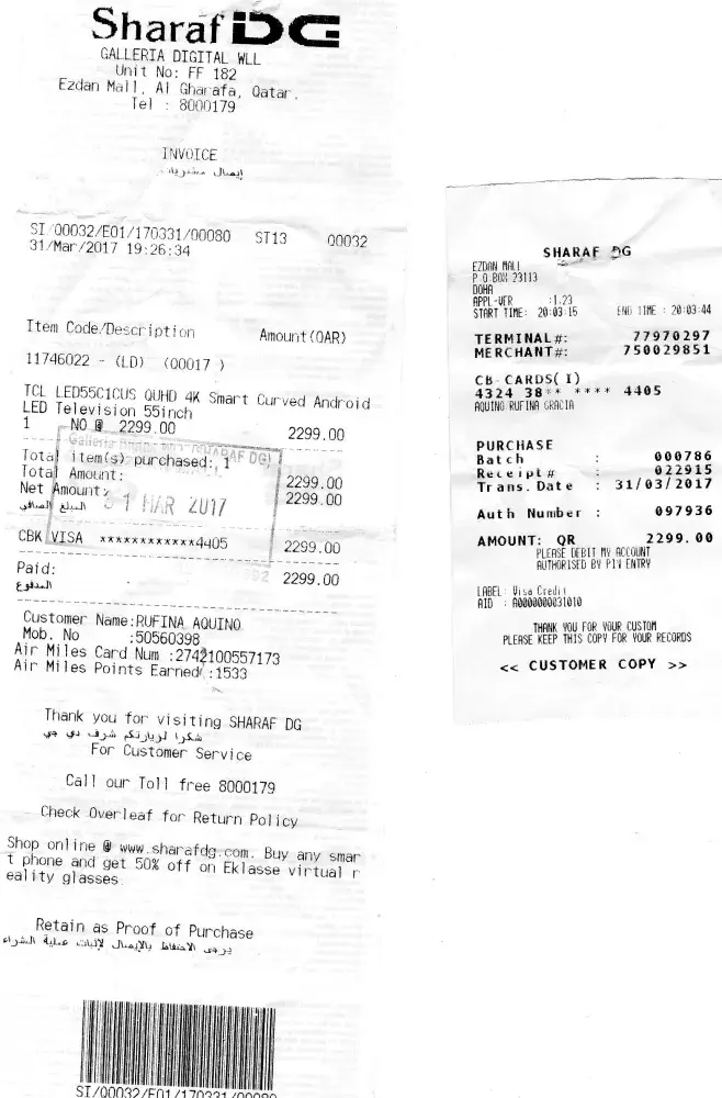 I bought a TV from Sharf DG against the invoice # SI/01682/CM1/170405/00046 transaction on 5/4/2017