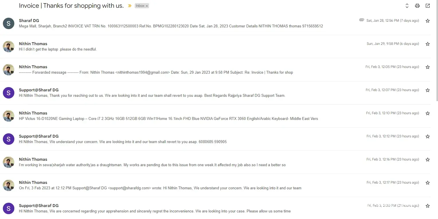 [11:19 am, 03/02/2023] Nithin Thomas KRV: I booked one laptop from sharaf dg. one week before. Still I didn’t get.. they promised me to give by last monday.. now they are saying not in stock. there is no solution for that