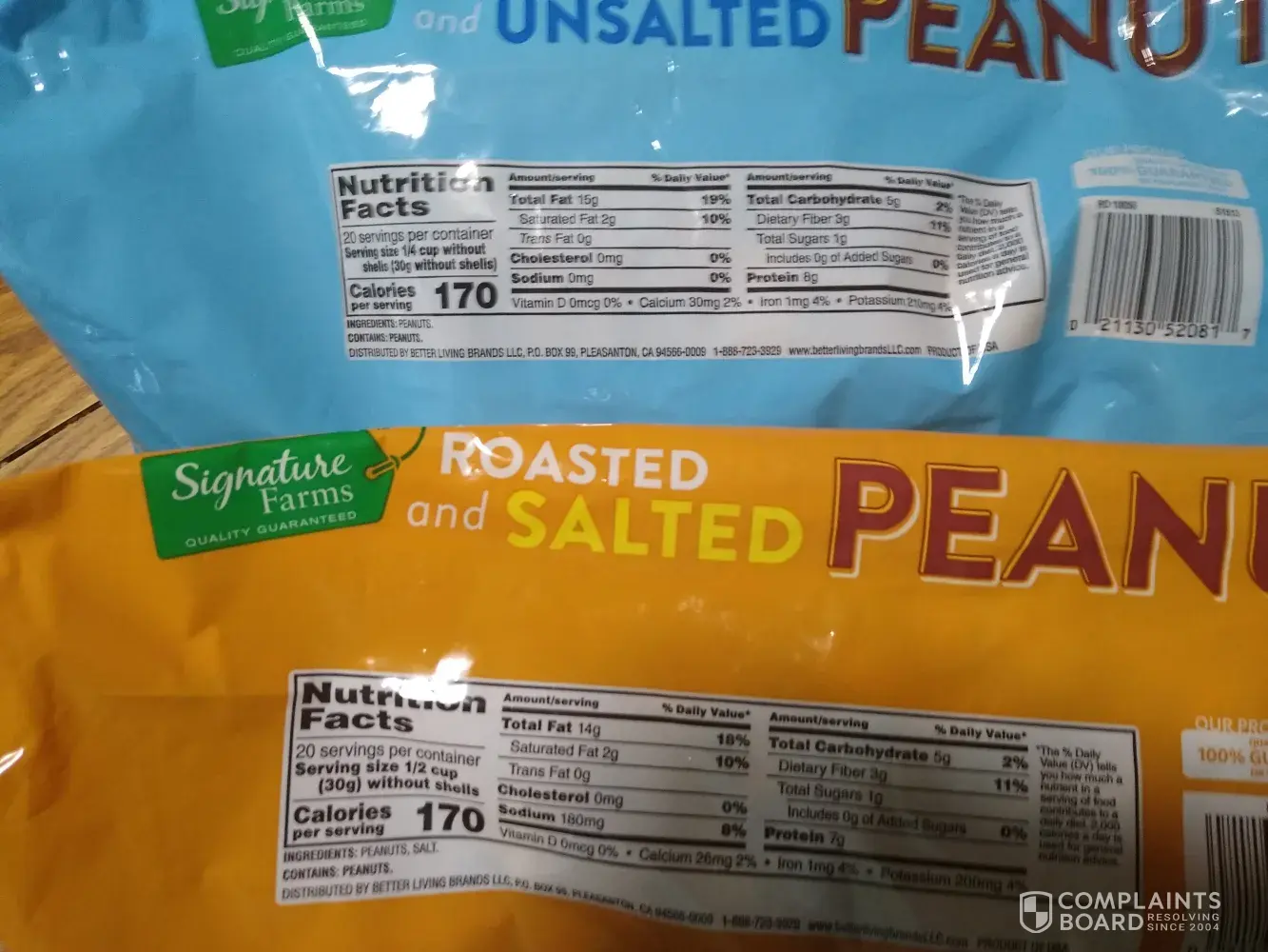 The calorie count is wrong on the Signature Brand Peanuts for either the salt or unsalted .