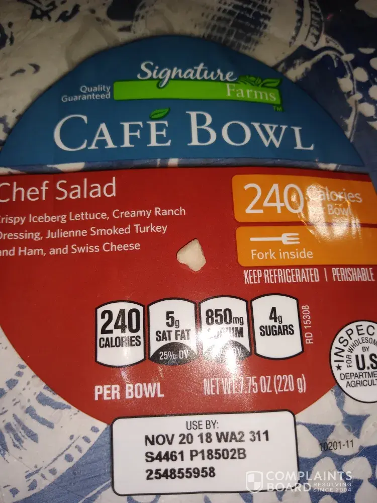 I purchased the signature farms Cafe bowl from the Shaw's location in Shrewsbury and there was a hard piece that almost looks like a bone in my salad I took a picture of the object
