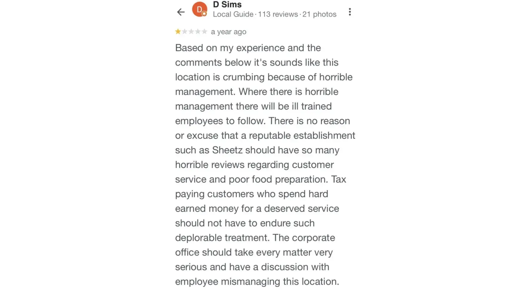 Sheetz earns a 1.0-star rating from 5 reviews and 1500 complaints, showing that the majority of convenience store patrons are dissatisfied with overall shopping experience.