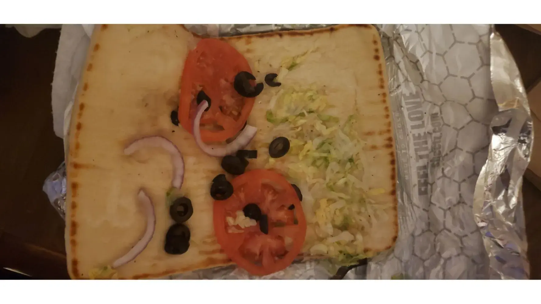 This is a "veggie sub with fries on top" I called the manager and was told this is correct. No...this is a Flatbread with toppings. It's nice to know that vegans and vegetarians are forced to eat THIS and pay regular prices. I'll definitely be filing a charge back for false advertising. This company hires whatever breathes anymore and the employees are rude...the management is usually worse and hangs up on you.