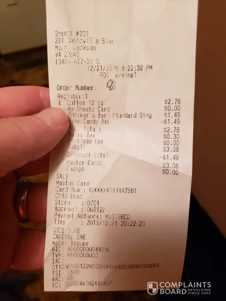 I hate complaining but this has become a regular occurrence. I live 2 blocks from this sheetz location at Crawford ave. And 119 and i have had quite a few bad experiences with service (attitude). Then today coffee was suppose to be free and we were charged for 2 cups because my mothernlaw requested a different lid. Very disappointed with this and the past few occurances.